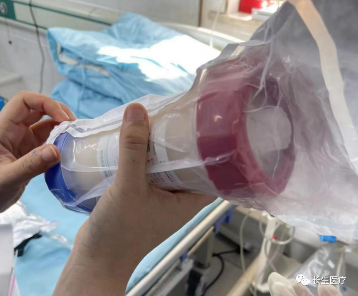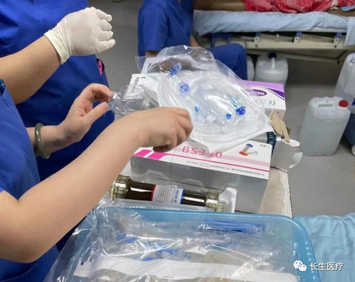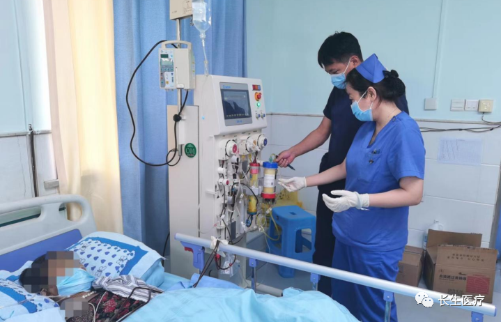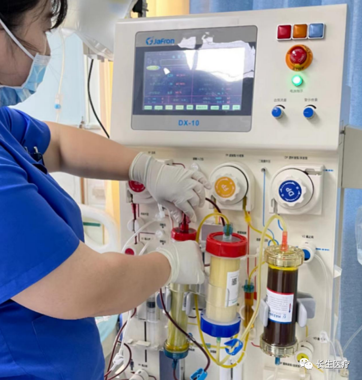 在血透科胡洪波院长决定,迅速对该患者实施集成血液净化,即“人工肝”治疗:DPMAS(双重血浆分子吸附系统)+血浆置换(PE)治疗。由于科室从未开展过此项治疗,经过3日材料准备、护士治疗技术的紧急培训,在康安医院血液透析科李主任指导下开始了治疗。