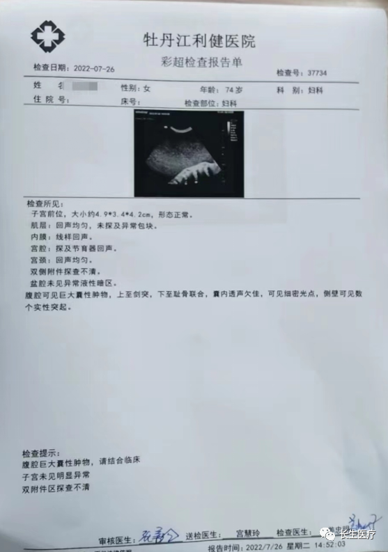 7月27日牡丹江利健医院妇科主任宫慧玲接诊了一位极为特殊的病人:女性患者,74岁,身体极度消瘦(90斤)但却腹大如鼓。老人家自诉:自己平日里多胃胀,近期腹围增长迅速,故来就诊。B超检查示腹腔巨大囊性肿物,上至剑突,下至耻骨联合。如此巨大卵巢肿瘤在临床上极为罕见。