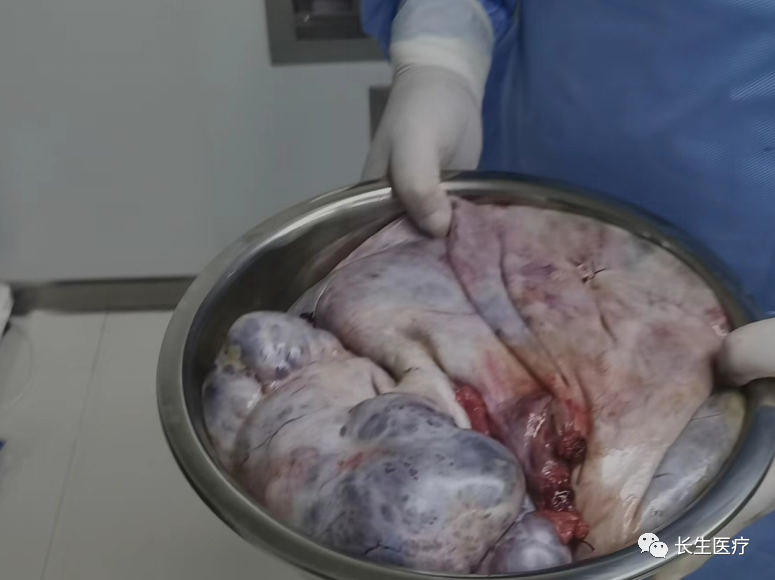 8月2日12:30手术开始,至12:50共吸出卵巢肿物内粘液量近4000毫升(8斤)后探查盆腹腔,肿物与肠系膜广泛粘连,予以松解后,将肿物托出盆腹腔开始行肿物切除术,切除肿物净重约12斤,至此总重量近20斤的肿物摘除完毕。术中冰冻病理回报:左卵巢粘液性交界性肿瘤,局灶可疑浸润。即行全子宫加右侧附件、大网膜及阑尾切除术。